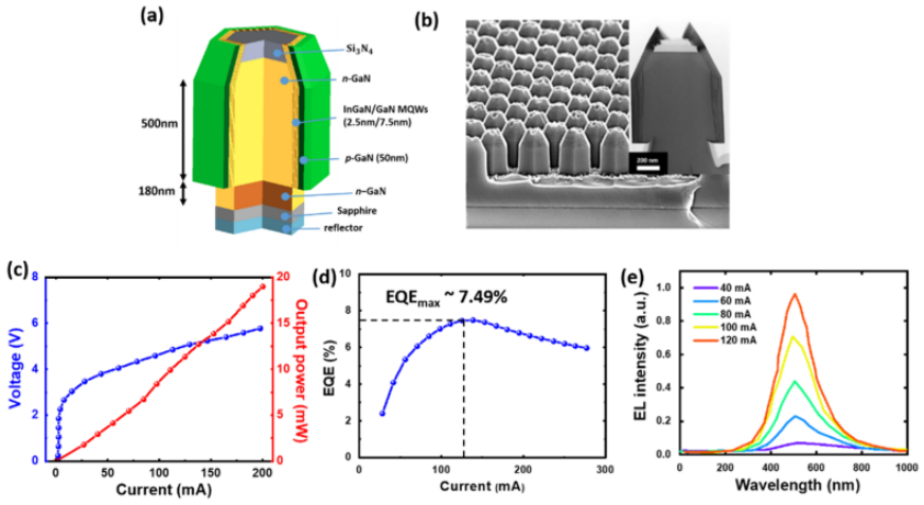 , Hao-Chung KuoIn this study, we investigated the characteristic difference between the two different configurations of the three-dimensional shell–core nanorod LED. We achieve a degree of polarization of 0.545 for tip-free core–shell nanorod LED and 0.188 for tip core–shell nanorod LED by combining the three-dimensional (3D) structure LED with photonic crystal. The ability of low symmetric modes generated by photonic crystals to enhance degree of polarization has been demonstrated through simulations of photonic crystals. In addition, light confinement in GaN-based nanorod structures is induced by total internal reflection at the GaN/air interface. The combination of 3D core–shell nanorod LED and photonic crystals cannot only produce a light source with a high degree of polarization, but also a narrow divergence angle up to 56°. These 3D LEDs may pave the way for future novel optoelectronic components.